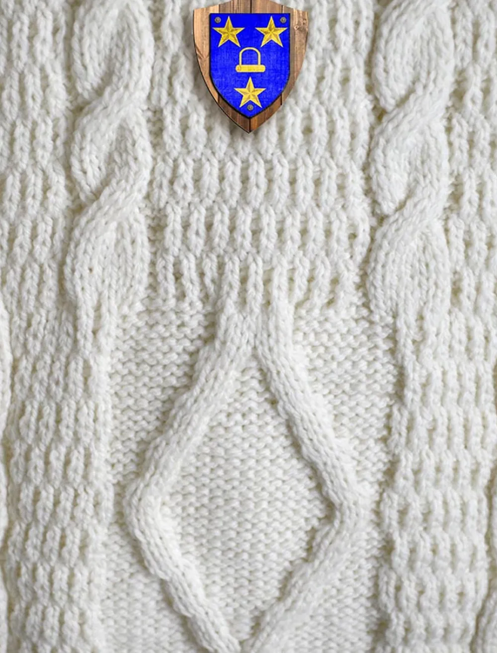 This beautiful MurrayClan Aran Throw (measuring 64″ by 40″) has been produced in the traditional báinín (pronounced ‘baw neen’) colour, the natural white of the wool. It comes to you complete with a clan history and crest.